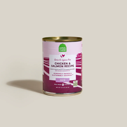 Open Farm’s Chicken & Salmon Pate is a rich, smooth wet food made with wild-caught salmon, humanely raised chicken, and chicken liver.