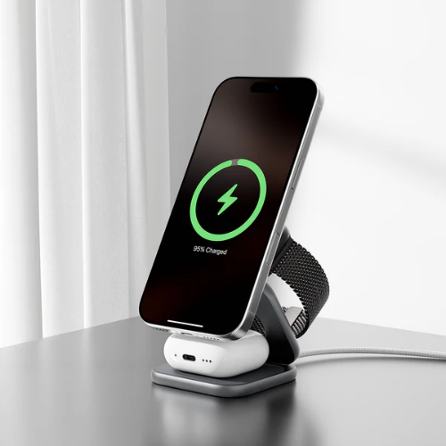 The Kuxiu X40 Turbo is a foldable 3-in-1 charging stand. It charges your phone, smartwatch, and earbuds all at the same time. This stand is compact enough to fit in a backpack, carry-on, or tech pouch. It charges devices faster than standard wireless chargers, making it perfect for layovers, hotel stays, or short work breaks. It is designed for travelers oranyone who wants an organized way to charge multiple devices without extra cables.