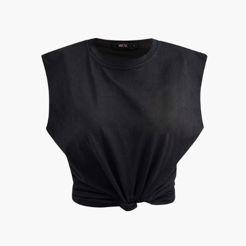 The unique padded shoulders add a modern twist to the classic T-shirt, creating a silhouette that is both flattering and fashion-forward. Paired with the knot hem detail, this top is designed to be a standout piece at any music festival or casual outing.