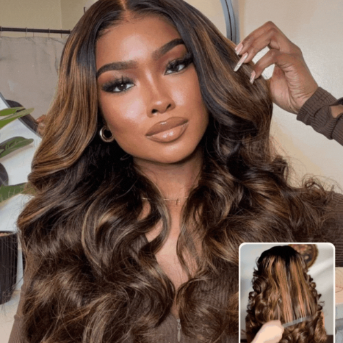 This UNice 7x5 Bye Bye Knots and 13x4 Pre-Everything Wig is wonderful for styling in a simple way. This is a glueless lace wig with balayage highlights and soft body waves for a natural, trendy look.